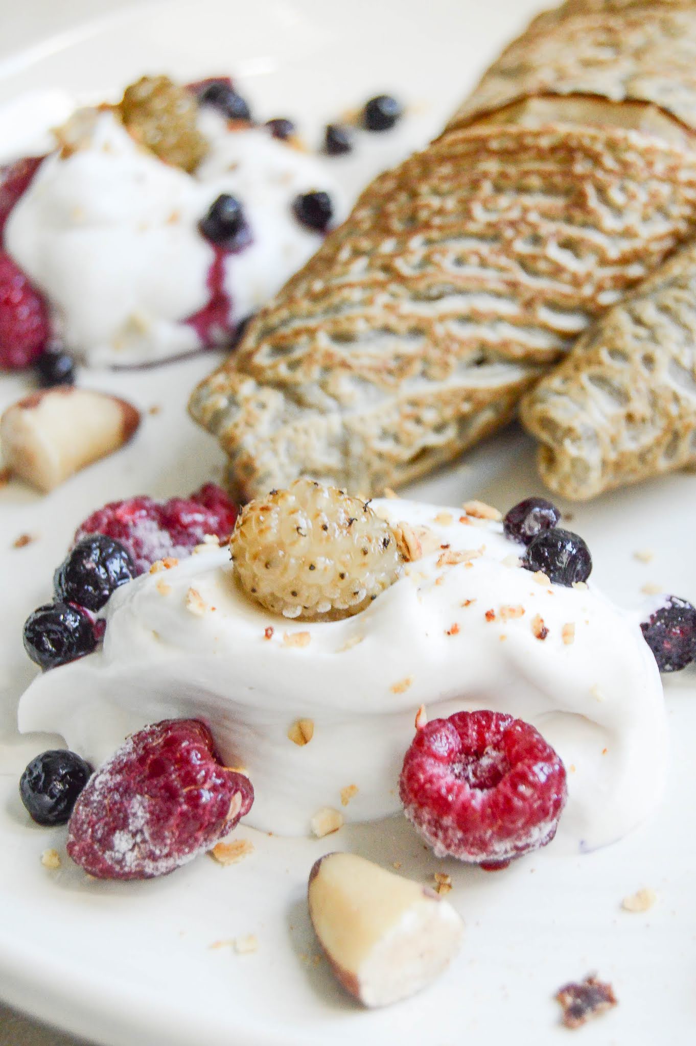 А отстрани пък има изстудена кокосова сметана със замразени плодове, ядки и гранола, и всичко е полято с мед! 🍯🥞