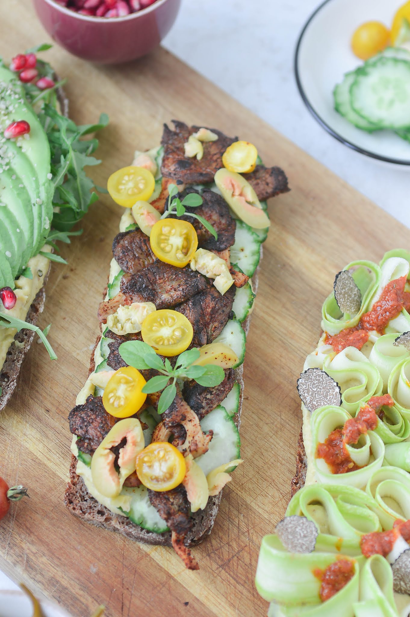 Знам обаче, че сандвичите могат да са доста скучни и невълнуващи, и затова днес предлагам 3 различни вкуса върху една и съща основа от ръжен хляб с квас, намазан дебело с домашен хумус с лешници и босилек. 🍞