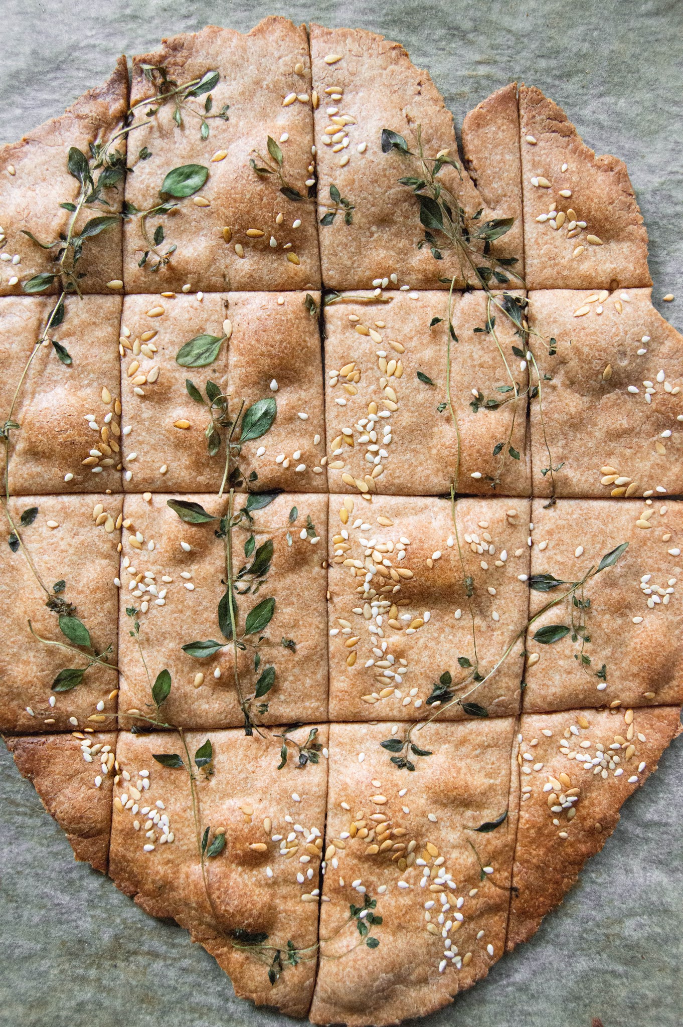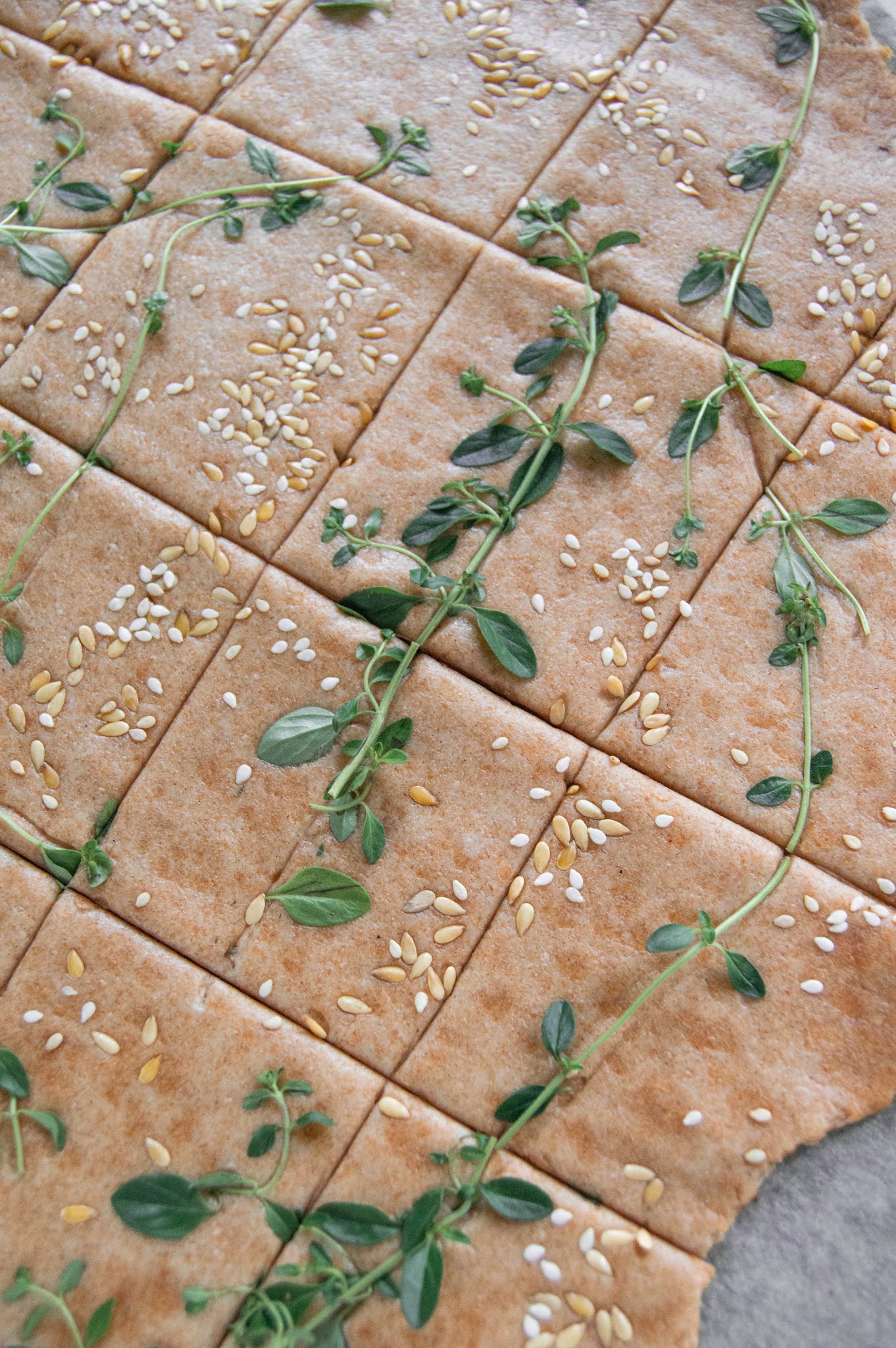 - Разточвате леко охладеното тесто до 0.5см дебелина, отгоре подреждате стръкчетата мащерка и поръсвате със семената